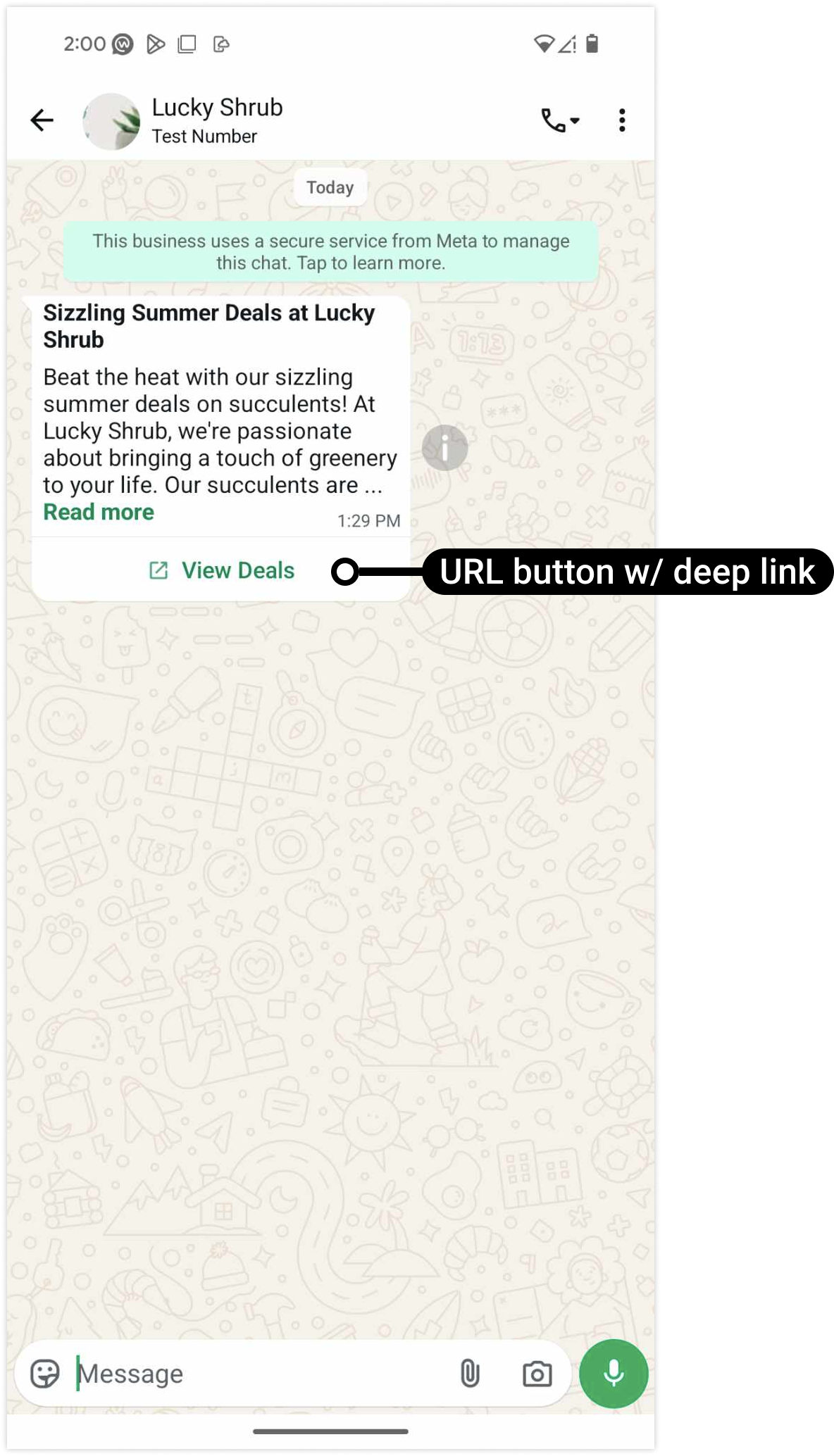 Checkout button templates are marketing templates that can showcase one or more products along with corresponding checkout buttons that WhatsApp users can use to make purchases without leaving the WhatsApp client. Checkout button templates can show a single product image or video header, along with message body text, message footer, a single checkout button, and up to 9 quick-reply buttons.